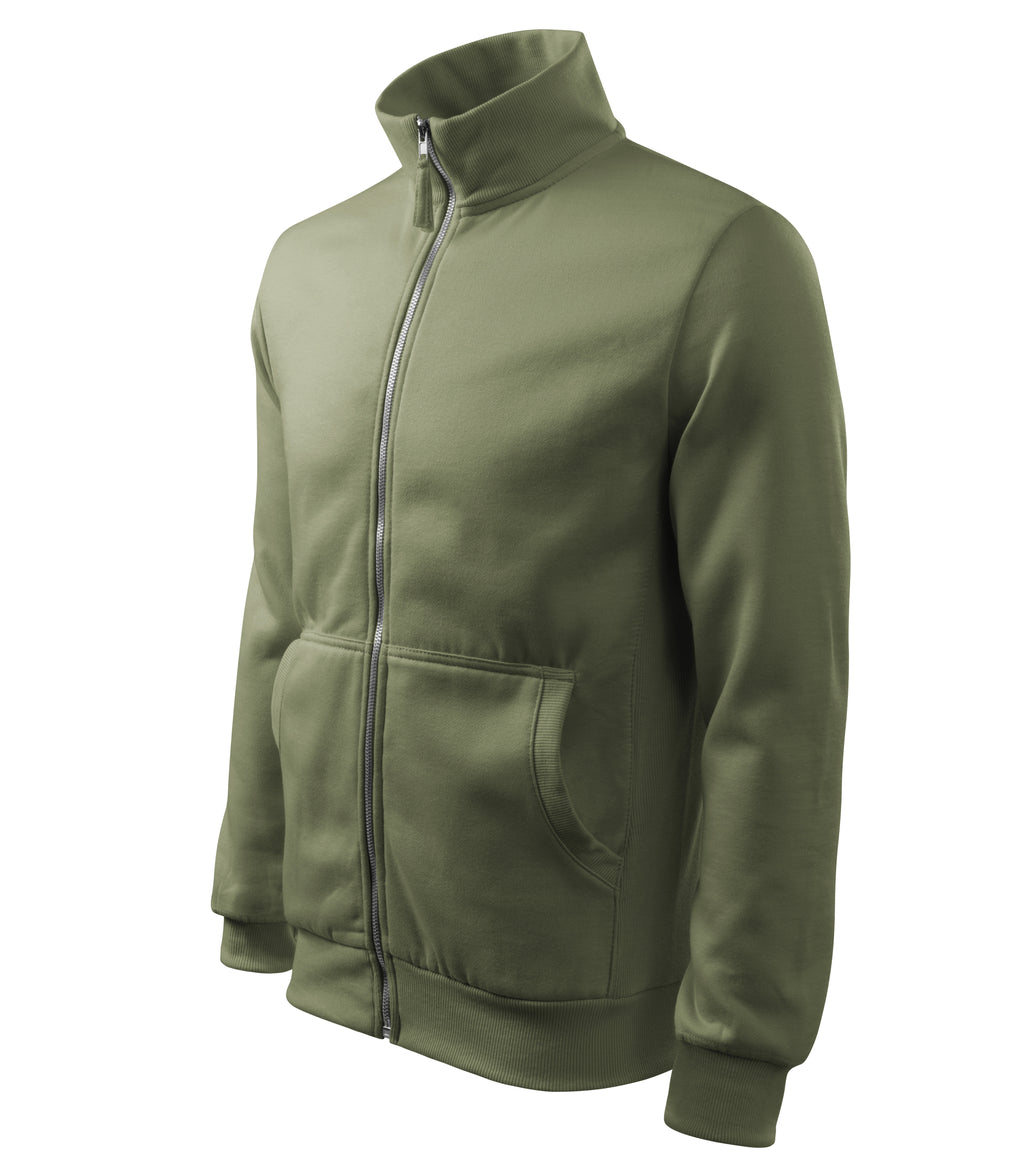 gerader Schnitt mit Seitenteilen, durchgehender Metallreißverschluss, Stehkragen und Seitenteile aus einem 2:2 Rippstrick mit 5 % Elastanzugabe, Innerer Kragen durch ein gewebtes Kontrastband versäubert, aufgesetzte Kängurutaschen, unterer Rand, Ärmelmanschetten und Taschensäume aus 2:2 Rippstrick mit 5 % Elastanzugabe, Innenseite gekämmt