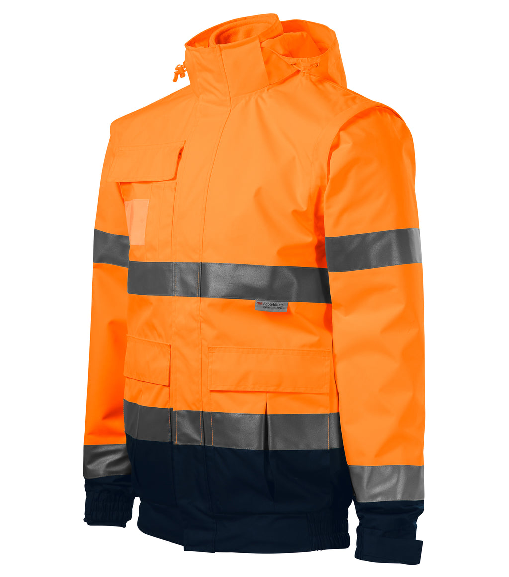 hochsichtbare Kleidung, Mehrzweckverwendung 4 in 1 in zweifarbigem Design, Äußere Jacke, wasserdichtes, atmungsaktives, fluoreszierendes Material , zertifizierte retroreflektierende Bänder 3M, durchgehender Krampenreißverschluss mit Reißverschlussklappe, abnehmbare Kapuze mit befestigtem Schirm, versteckt im Kragen, Kapuze und untere Saum mit elastischem Kordelzug einstellbar, abnehmbare Ärmel, Ärmelsäume mit elastischem Band, einstellbar mit Klettverschluss , multifunktionale Taschen mit Klappe und Seitentaschen, Brusttasche mit Reißverschluss und Klappe, Tasche für ID Karten und Kugelschreiber, untergeklebte Nähte, Zugang für Branding im Futter des Rückenteils, Zertifizierung nach den Normen EN ISO 20471/A1 (Klasse 3, 1), EN 343 (Klasse 4:1) und EN ISO 13688, Innenseite Fleece:, herausnehmbare innere Fleecejacke, wärmendes fluoreszierendes Material, zertifizierte retroreflektierende Streifen 3M, durchgehender Krampenreißverschluss, Taschen mit Krampenreißverschluss, mit einem elastischen Streifen gesäumt, Anti-Pilling-Bearbeitung an beiden Seiten, Zertifizierung nach den Normen EN ISO 20471/A1 (class 2) und EN ISO 13688